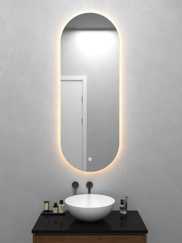 Безрамное зеркало овальной (капсульной) формы с контурной (тыльной) тёплой подсветкой, свет 3000К. Подложка из высококачественного МДФ, светодиодная лента защищена матовым свето-рассеивателем от попадания пыли и влаги. Есть вывод 220W для подключения к сети, включение подсветки от сенсорной кнопки на зеркале.