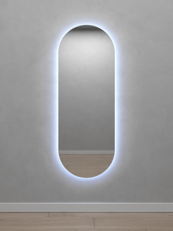 Безрамное зеркало овальной (капсульной) формы с контурной (тыльной) холодной подсветкой, свет 6000К. Подложка из высококачественного МДФ, светодиодная лента защищена матовым свето-рассеивателем от попадания пыли и влаги. Есть вывод 220W для подключения к сети, включение подсветки от выключателя на стене, либо от розетки.